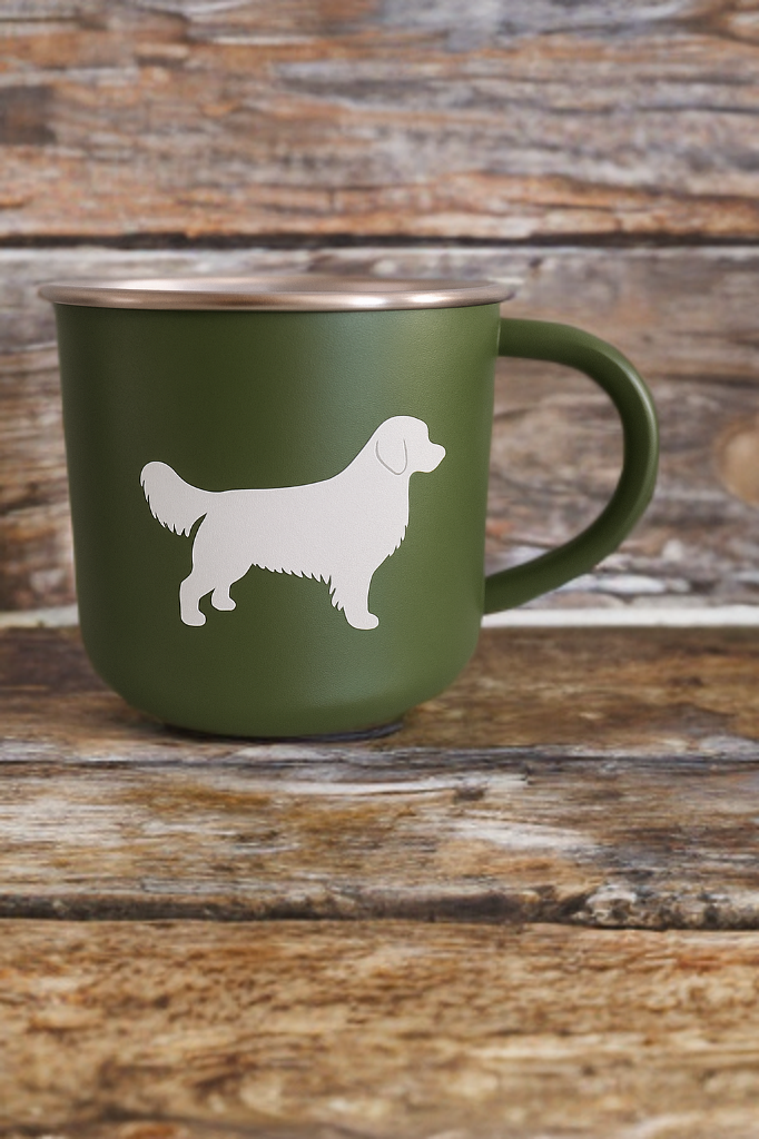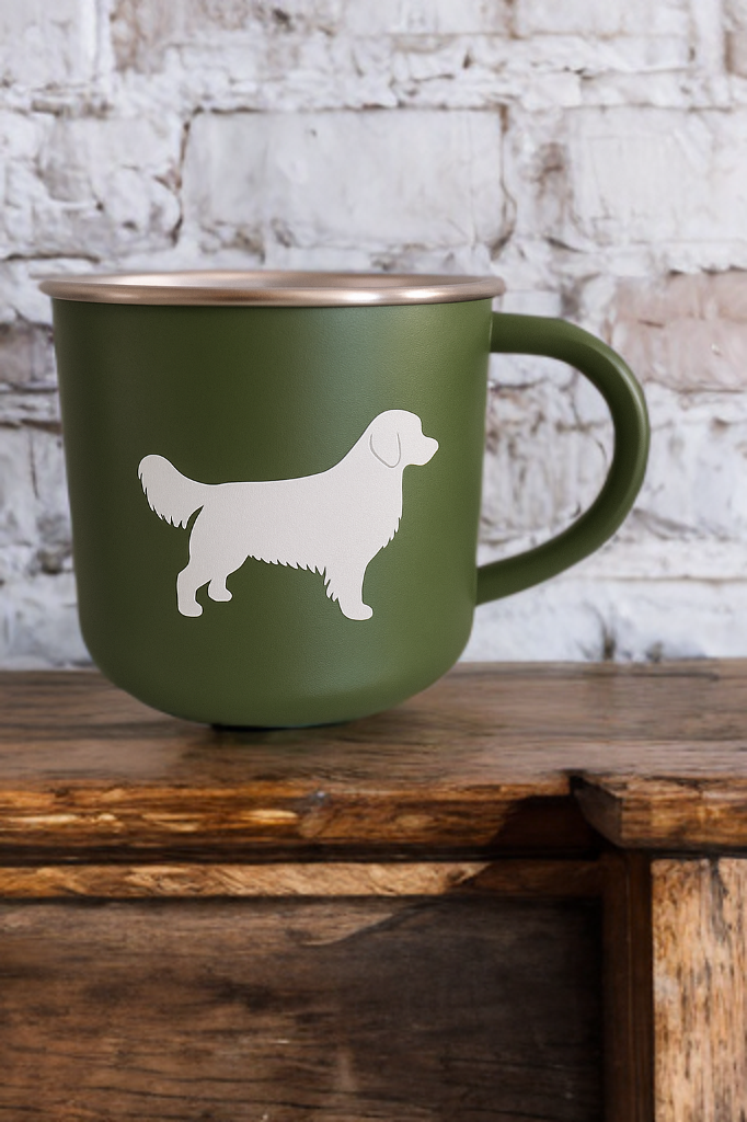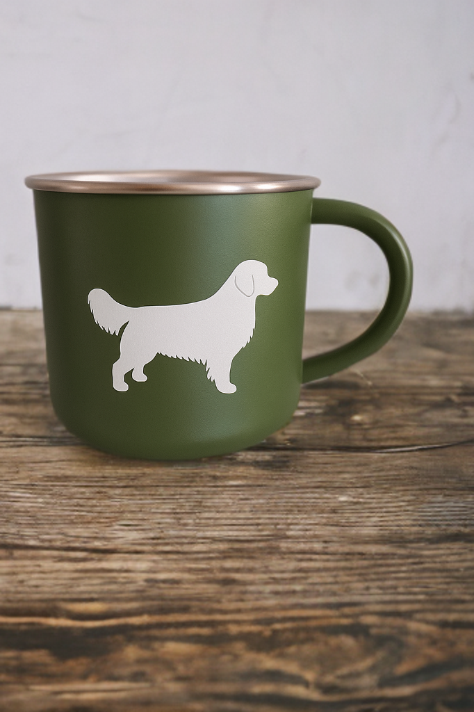 Tazza in acciaio inox riciclato color verde bosco, leggera e resistente, con il profilo del Golden Retriever di Valle della Mela. Perfetta per bevande calde, ovunque tu sia.