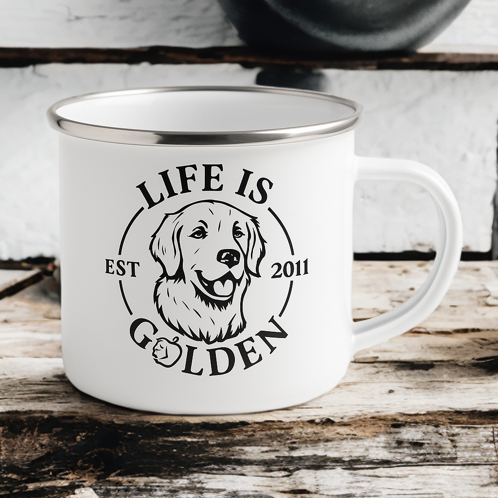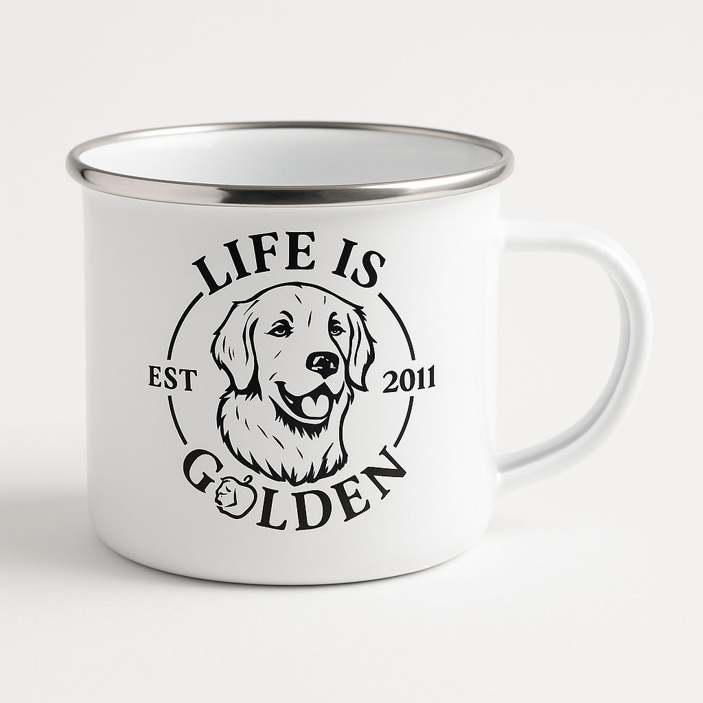 Tazza in metallo smaltato, leggera e resistente, con stampa sublimata del Golden Retriever. Perfetta per casa, pic-nic, viaggi e momenti di relax. Un must-have firmato ‘Life is Golden’